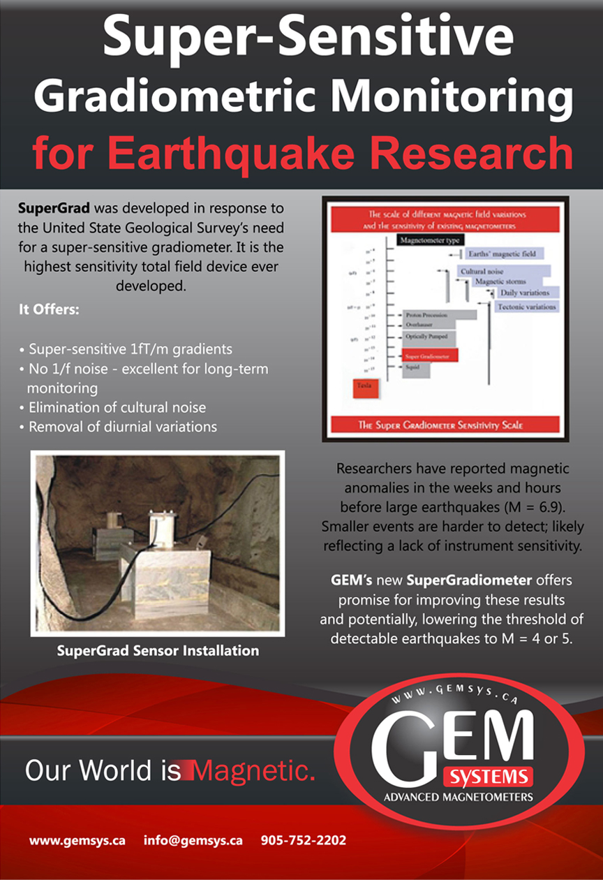 GEM’s new SuperGradiometer is designed to improve detection of subtle responses and potentially lower the threshold of detectable earthquakes. SuperGrad is the highest sensitivity total field measuring device ever developed with a 0.05 pT root-mean-square (rms) sensitivity at a sampling rate of 20 Hz (averaged over a 1 second interval). This sensitivity is well over an order-of-magnitude more sensitive than any other system.