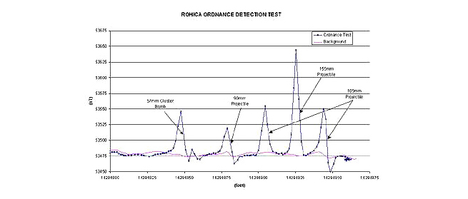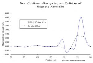 Magnetometer surveys use both individual sensors and multiple sensors (gradiometers). Individual sensors acquire total field data that may exhibit “characteristic signatures.” Sensors in gradiometer mode (i.e. multiple sensors deployed) record mappable gradients or differences that focus specifically on shallow depths of investigation. They are effectively “tuned” to the near surface in which many UXO are located.